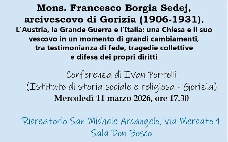 Ricorrono i 120 anni dall’insediamento di mons. Francesco Borgia Sedej come arcivescovo di Gorizia (1906-1931). Fu un periodo straordinario, meraviglioso e drammatico: la nostra diocesi era sotto l’Austria, si scoprono i mosaici di Aquileia, poi la terribile Grande Guerra e l’arrivo dell’Italia nazionalista e poi fascista. La conferenza del prof. Ivan Portelli mercoledì 11/03 alle 17.30 in Ricreatorio San Michele, in via Mercato 1. Interventi musicali di Davide Cibic.